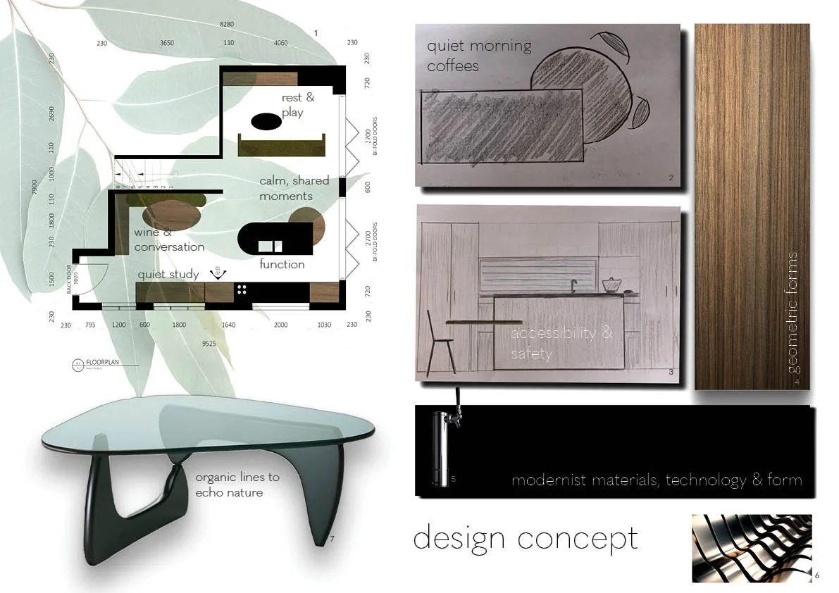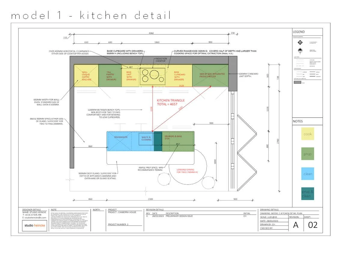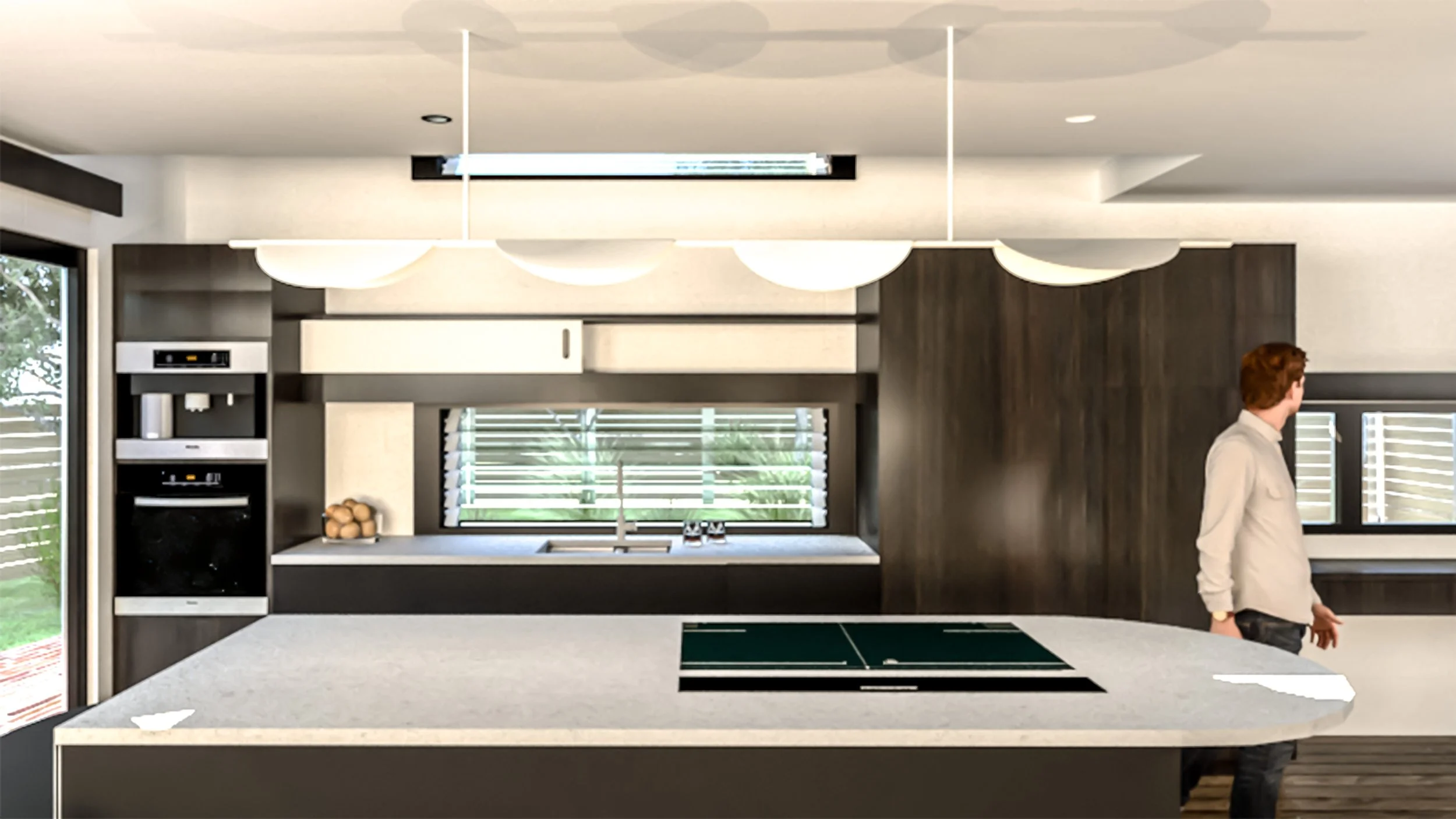 A key focus was the kitchen, designed with strict adherence to Australian Standards, NCC Regulations and ergonomic principles such as the working triangle. Extensive research ensured maximum functionality, while spatial planning incorporated SketchUp block diagrams and movement pattern analysis to optimize flow. Consideration of shifting natural light informed the placement of finishes and materials, enhancing the home’s warmth and livability throughout the day.