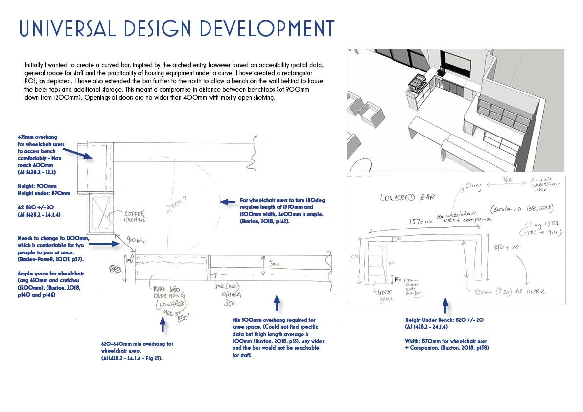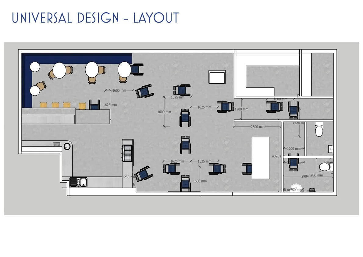 Universal Design was a central focus of this project. Comprehensive research and Australian Standards informed every decision, ensuring the entire space was accessible and accommodating. Dedicated quiet and private areas address the diverse needs of both customers and staff. Restrooms, point-of-sale zones, bar seating, and general seating areas have all been thoughtfully designed for full wheelchair access, exemplifying a commitment to inclusivity and functionality without compromising on style.