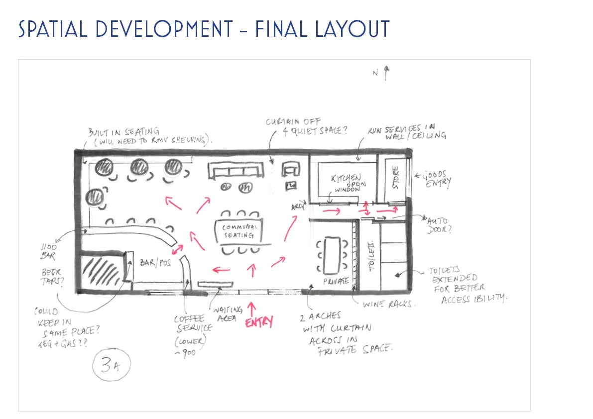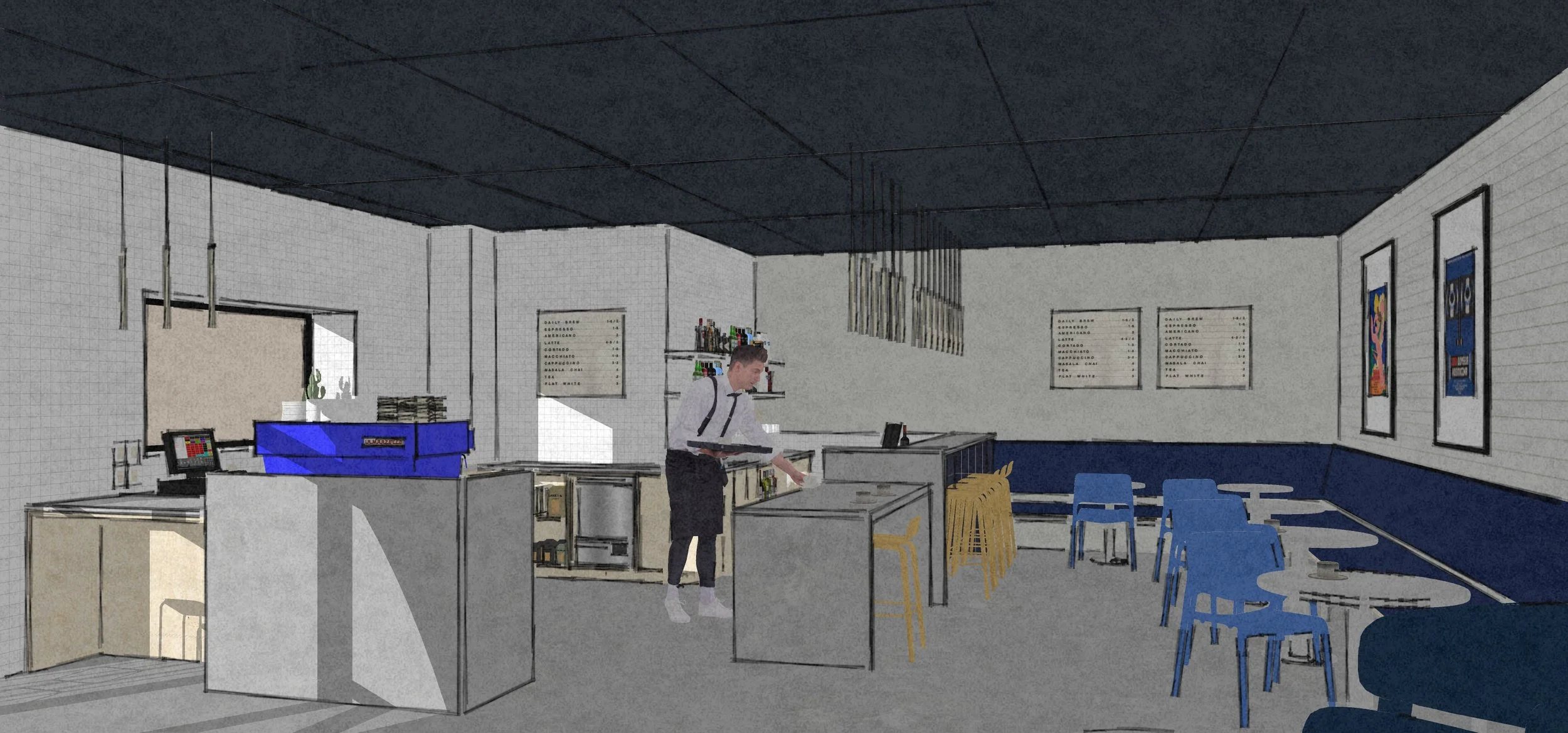 The project involved a full site analysis, with a focus on the Point of Sale, leading to a data-driven layout exploration and concept development. The process included sketches, expressive renders, and a detailed technical drawing set.