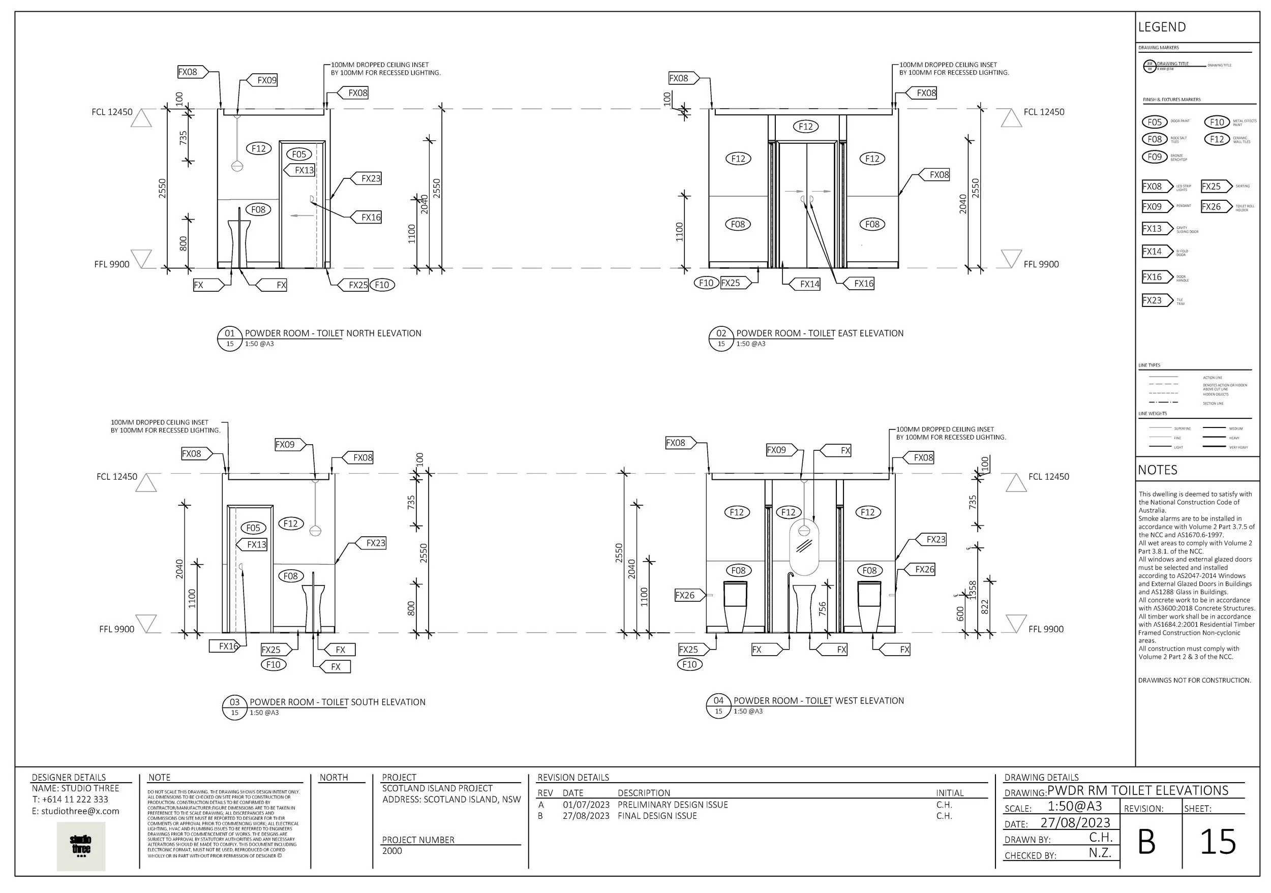 A selection of the technical drawings developed for this project. The floor plan presented a unique challenge with its angular geometry, three levels, and uneven walls, compelling me to enhance my CAD skills through dedicated research and practice.