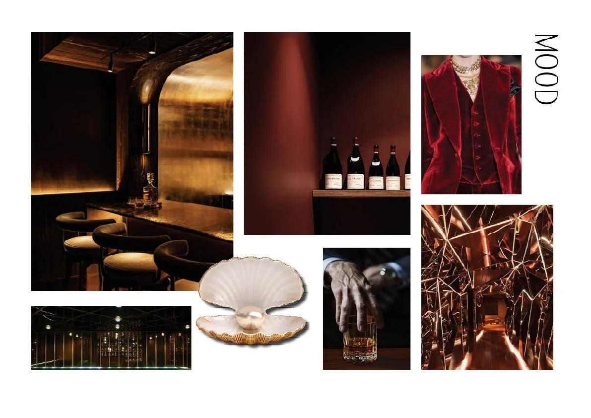 Inspired by the allure of hidden treasures, the 'Buried Jewel' concept redefines the transitional spaces of the hallway and mud room to create an element of surprise upon entering the underground bar. Carefully positioned mirrors generate playful illusions, crafting false door effects that engage the visitor’s curiosity. Subtle hints of what lies beyond are revealed through pearl wall lights and accents in golden and red hues, setting the stage for a luxurious and unexpected reveal.